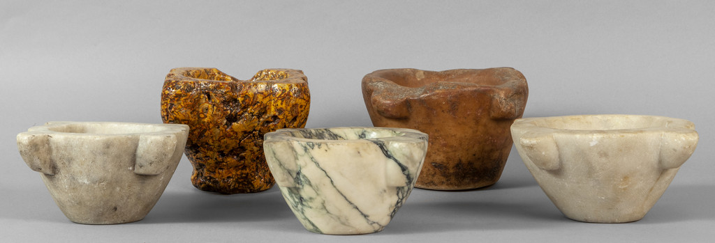 Cinque mortai in marmo: uno in breccia medicea uno in broccatello due in marmo bianco uno a patina scura sec.XVI