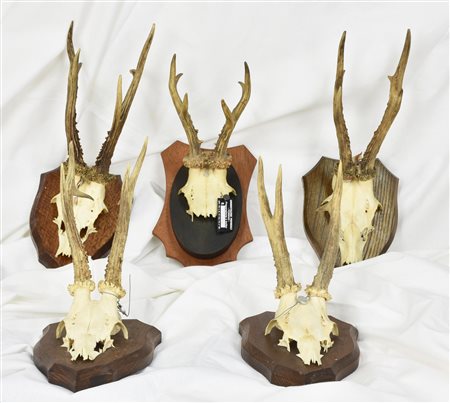 LOTTO DI 5 TROFEI DI CACCIA con corna di capriolo montati su scudi in legno...