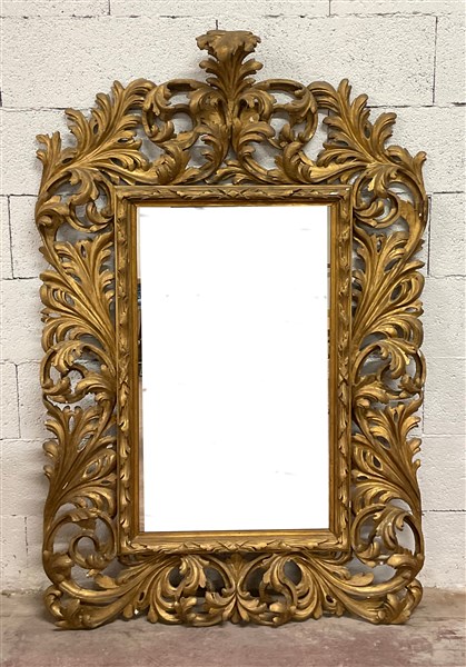Specchiera di forma sagomata con cornice in legno dorato, traforato e scolpito a girali fogliate (cm 140x92) (difetti e mancanze)