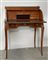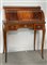 Scrittoio a rullo da centro filettato in legno chiaro, pianetto estraibile rivestito in marocchino, anta celante sette cassettini e vani a giorno, tre cassetti in linea sottopiano, gambe mosse, ringhierina, fregi e scarpette in metallo dorato e cesellato (cm 82x105x50) (difetti)