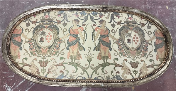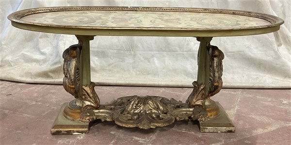Tavolino da salotto in legno intagliate, laccato e dorato,base decorata da sezioni di vasi biansati riuniti da pianetto sagomato e traforato, piano ovale decorato con tessuto ricamato (cm 123x54x62) (difetti e mancanze)