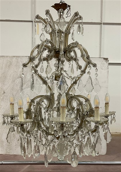 Lampadario a nove luci in metallo e vetro decorato con pendagli, rosette a cate
