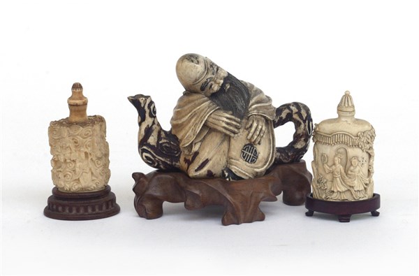Teiera e due snuff bottles in osso, basi in legno Cina, inizi sec. XX (h. max c