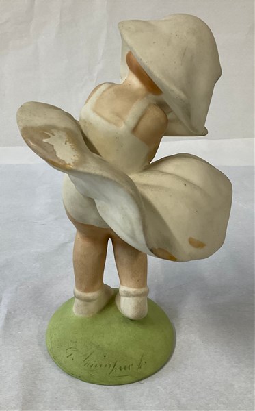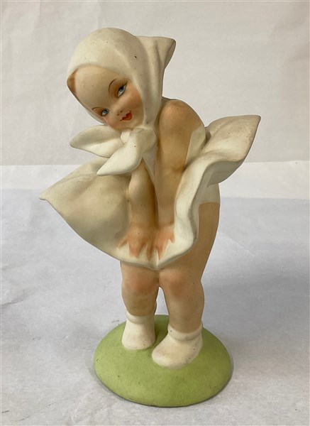 Scultura in ceramica policroma smaltata opaca raffigurante una bambina col vestito al vento. Italia, secolo XX. Firmata alla base. (h cm 25) (difetti)