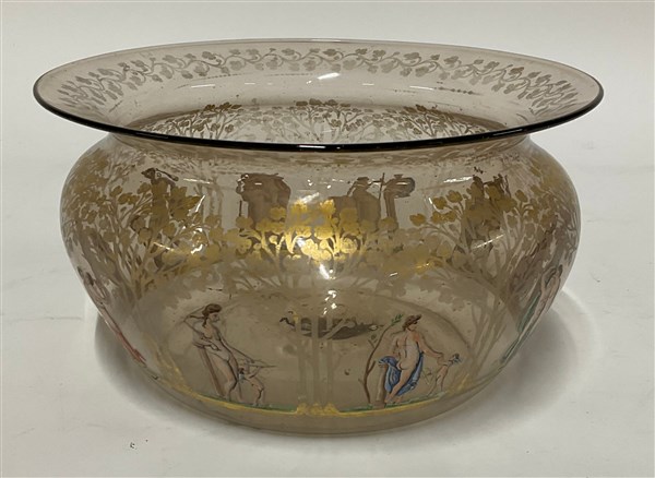 Ciotola centrotavola in vetro decorata a motivi vegetali, alberi e figure classiche in oro e policromia. Secolo XX. (h cm 14,5; d cm 25) (gravi difetti)