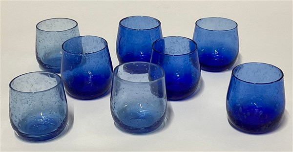 Gruppo di otto bicchieri in vetro blu con inclusione di bolle. Francia, secolo XX. (h cm 8,5)