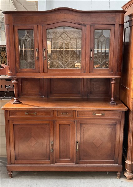 Credenza "Liberty" a due corpi lastronata e filettata, parte inferiore a tre ante e tre cassetti. Parte superiore con tre ante a vetri. Guarnizioni in metallo (cm 157x218x52) (difetti)