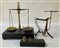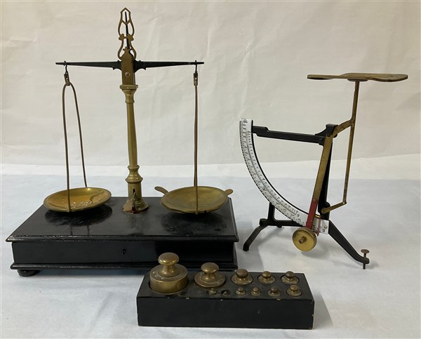 Lotto composto da una bilancia postale, una bilancia per preziosi e un set con pesi (h max cm 40) (difetti e mancanze)