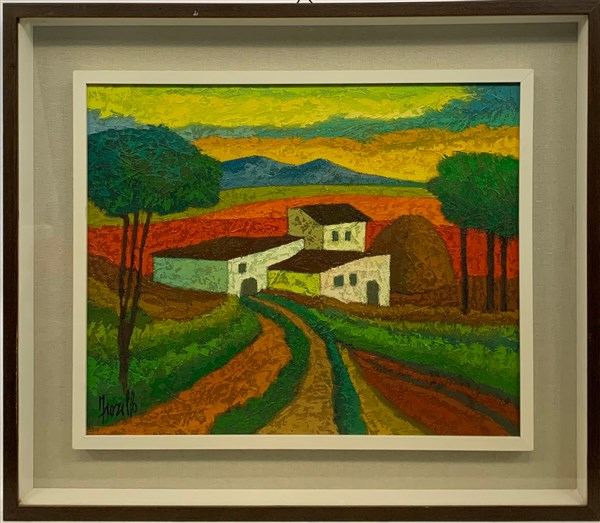 Lotto composto da tre dipinti a olio su tela raffiguranti paesaggi e figura, di