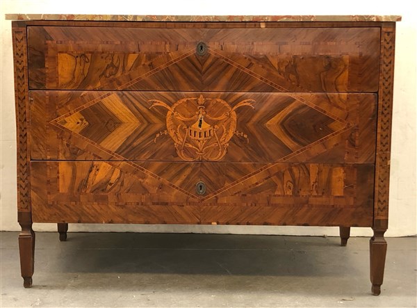 Comò a tre cassetti lastronato in noce e filettato in legno chiaro e intarsiato a rosoni e motivi vegetali, piedi rastremati, secolo XVIII. Piano in marmo non coevo (cm 123x90x59) (difetti, restauri e mancanze)