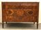 Comò a tre cassetti lastronato in noce e filettato in legno chiaro e intarsiato