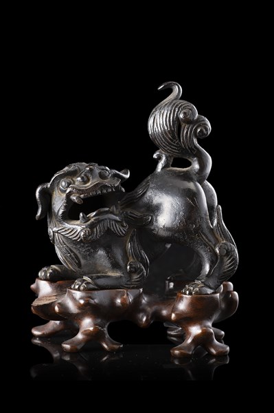 Lotto 263 | Leone buddhista in bronzo, base in legno Cina, secolo XIX (h. 10,5 cm.)