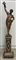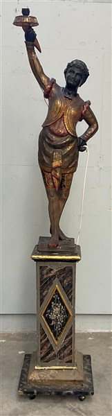 Scultura in legno laccato raffigurante moro reggitorcia montata a luce elettrica con base a plinto dipinta a finto marmo (h cm 176) (difetti)