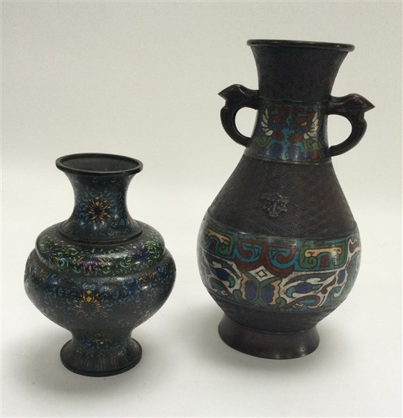 Due vasi in bronzo con decoro a smalto cloisonne. Giappone inizi sec. XX h. max 30 (difetti)