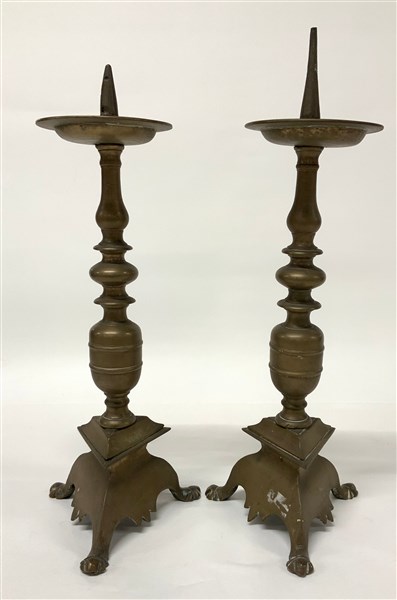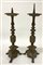 Coppia di candelieri tripodi a rocchetto in bronzo (h cm 40) (difetti)