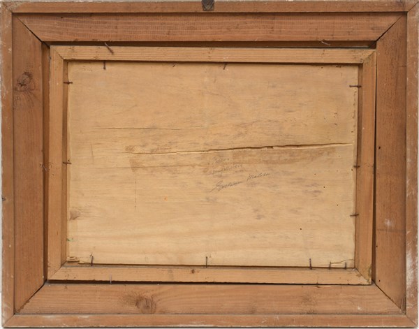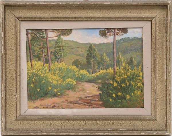 "Bosco" 1944, olio su compensato (cm 34x48.5) Firmato in basso a sinistra. Al retro: titolato, locato Mugello, datato e firmato.In cornice (gravi difetti)