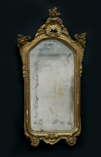 Specchiera di forma sagomata in legno dorato e intagliato a conchiglia, fiori e
