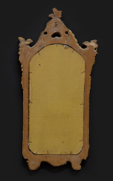 Specchiera di forma sagomata in legno dorato e intagliato a conchiglia, fiori e vlute (cm 84x43) (difetti)