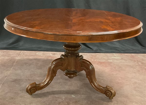 Tavolo in mogano con piano circolare apribile a vela, con maniglia sotto il piano a scatto, in bronzo. Sostegno tornito a balaustro con tre piedi sagomati e scanalati muniti di rotelle. Inghilterra secolo XIX. (d cm 137, h cm 78) (difetti)