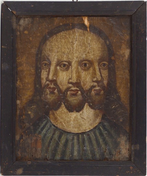 Ignoto, antico dipinto raffigurante "Cristo dalle tre facce" olio su tavola (cm34x27) (gravi difetti)