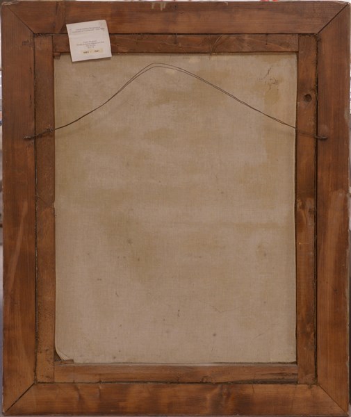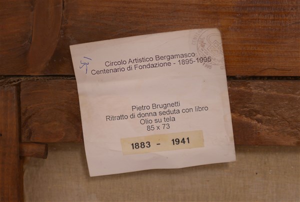 "Ritratto di donna seduta" 1929, olio su tela (cm 85x73) Firmato e datato in basso a sinistra.Al retro: cartiglio del Circolo Artistico Bergamasco. In cornice (difetti)