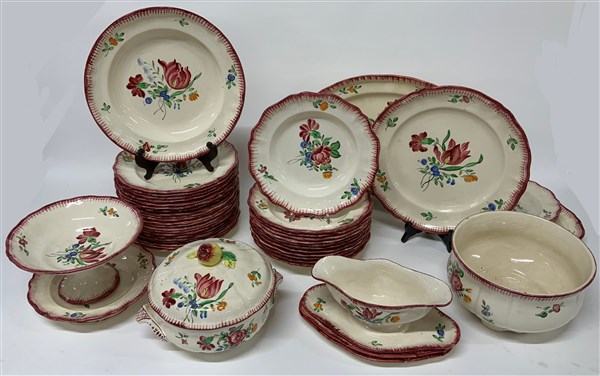 Manifattura di Longchamp, parte di servizio in ceramica decorata in policromia a fiori composto da: una zuppiera con coperchio, quattro piatti da portata ovali, due piatti da portata tondi, una insalatiera, tre alzatine, una salsiera, trentasei piatti piani, dodici piatti fondi e dodici piatti da frutta (difetti)