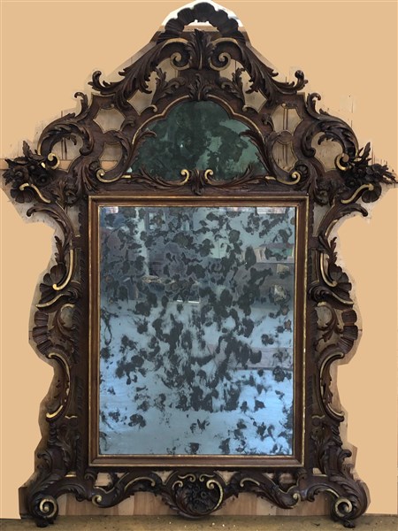 Lotto 384 | Caminiera di forma sagomata in legno intagliato a volute fogliate, fiori e ricc