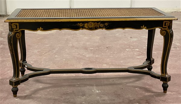Panchetto in legno laccato, gambe mosse unite da traverse, seduta incannucciata (cm 100x49x42) (difetti)