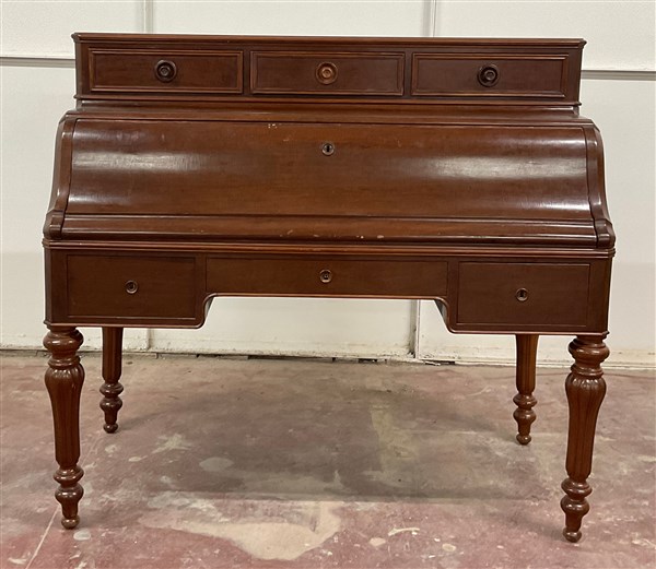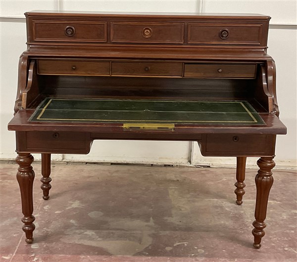 Scrittoio a ribalta con alzata. Alzata a tre cassetti il linea due dei quali con fronte ribaltabile, anta a ribalta scorrevole celante tre cassettini in linea e piano in marocchino verde impresso in oro, fronte a tre cassetti, gambe tornite e scanalate, secolo XIX (cm 130x119x66) (difetti)