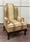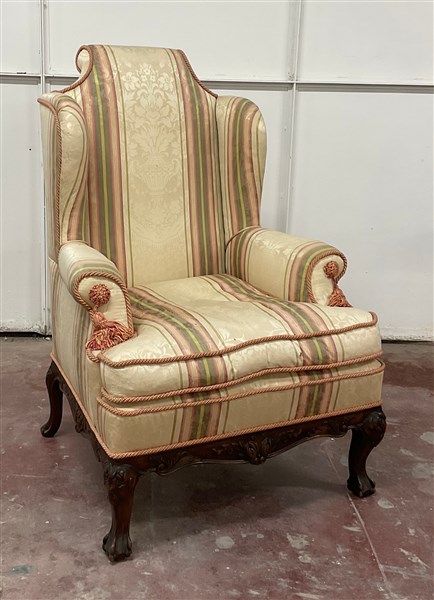 Poltrona ad orecchioni con fascia e piedi sagomati e intagliati, rivestita in tessuto a righe (difetti)
