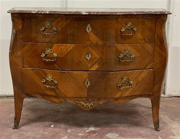 Cassettone di forma sagomata lastronato in radica, fronte mosso a tre cassetti, maniglie e scarpette in metallo dorato, piano in marmo rosso venato (cm 130x91x62) (difetti)