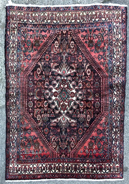 Tappeto Mossul, Persia, secolo XX. Decoro con medaglione bianco su campo blu (cm 203x140) (difetti e mancanze)