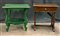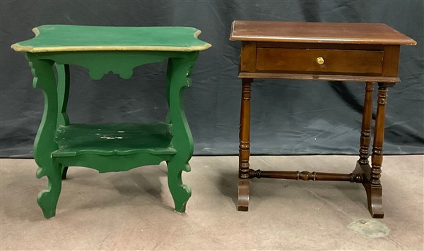 Lotto composto da un tavolino in legno laccato verde con montanti sagomati (cm 57x55x44), e un tavolino con cassetto e gambe tornite (54x57x35) (difetti)