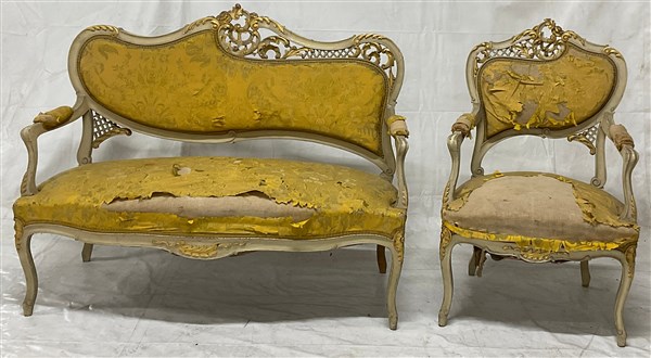 Fornitura da salotto composta da un divano a due posti e una poltrona. Legno intagliato, laccato e dorato con fasce traforate, rivestimenti in seta gialla (gravi difetti)