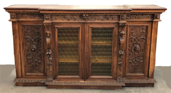 Credenza in legno intagliato e scolpito a teste e volute con quattro sportelli di cui quelli centrali con vetri (cm 201x110x52) (difetti)