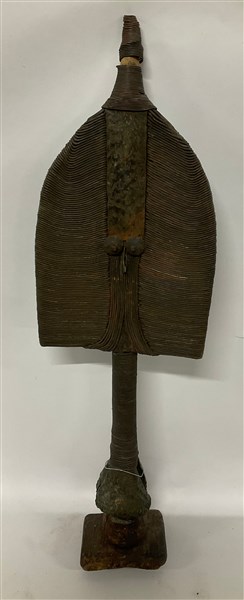 Arte africana, Gabon, maschera guardiano Kota in legno rivestito in rame battuto e a filo (h cm 77) (difetti)
