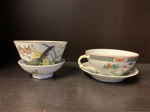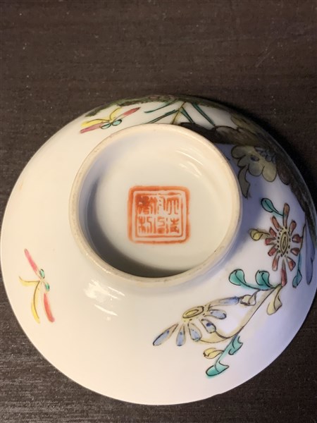 Lotto composto da una ciotolina con coperchio, una tazzina e un piattino in porcellana policroma