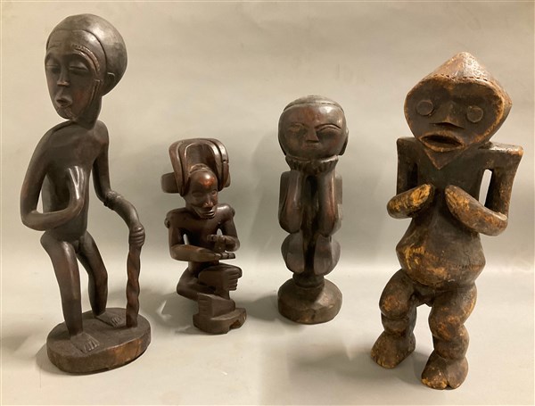 Arte africana, lotto di quattro figure stanti e assise, legno scolpito e pigmenti, etnie ed epoche differenti (h max cm 45) (difetti)