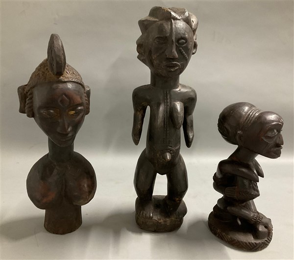 Arte africana, lotto di tre figure femminili, legno scolpito e pigmenti, etnie differenti (h max cm 46) (difetti)