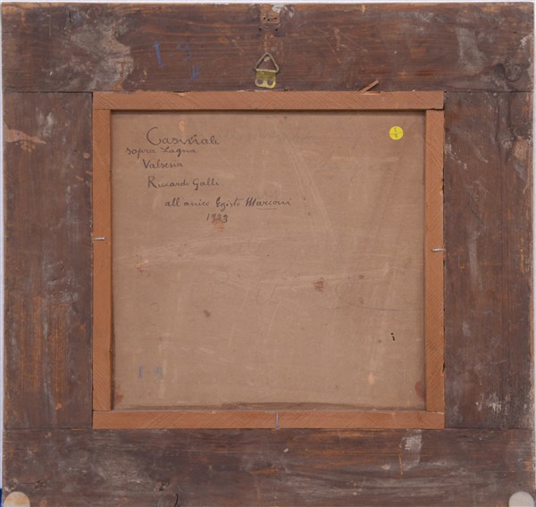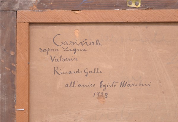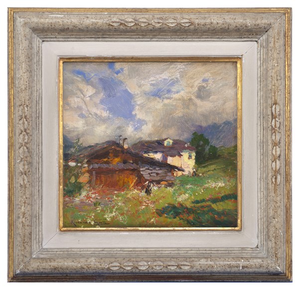 "Cascinale sopra Alagna in Valsesia" olio su cartone (cm 25.5x24.5) Firmato in basso a sinistra. Al retro: titolato, firmato, datato 1923 e dedicato. In cornice. Provenienza: Milano, Eredità Bernasconi