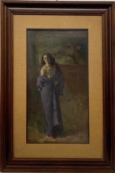 "Figura femminile" olio su tavoletta (cm 42x24) firmato in basso a destra, in cornice (lievi difetti)