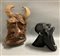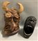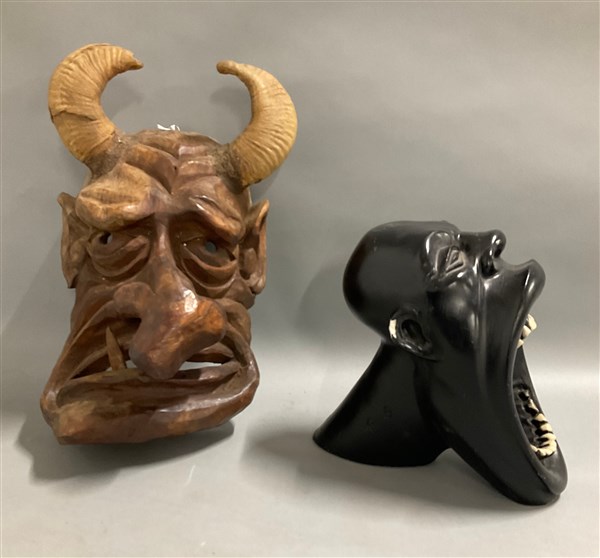 Lotto composto da una una scultura in gesso smaltato con figura maschile con la bocca aperta e una maschera in legno scolpito con corna animali (h max cm 33) (difetti)