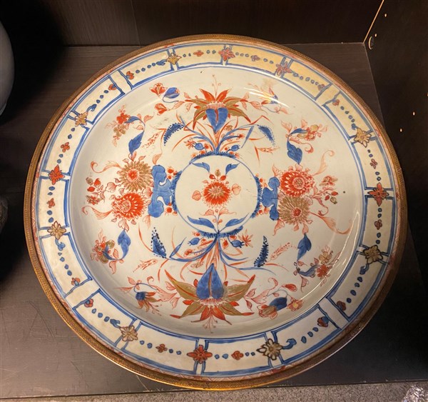 Un grande piatto in porcellana a decoro Imari con ghiera in metallo