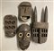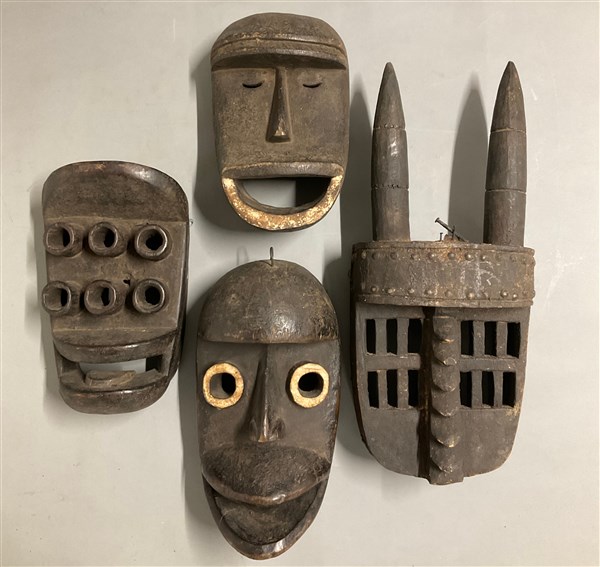Arte africana, lotto di quattro maschere in legno scolpito, pigmenti e borchie