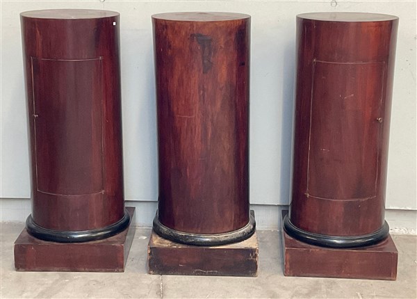 Gruppo di tre portavasi a colonna in mogano con anta, base quadrata e bordo ebanizzato (cm 44x103x44) (difetti)