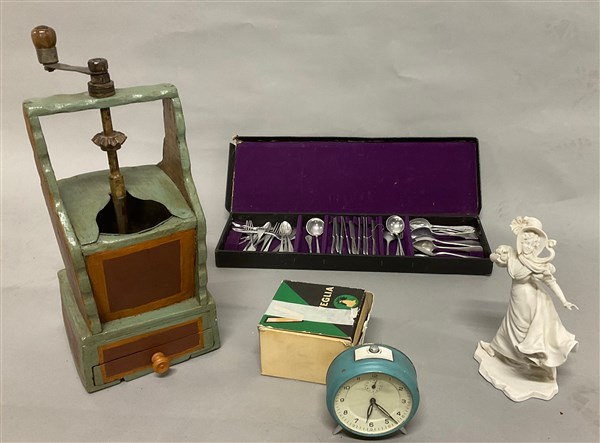 Lotto vario composto da un macinino con meccanismo in ferro e cassa in legno dipinto (h cm 36), una scultura in biscuit raffigurante una pattinatrice, una sveglia e una scatola contenente cucchiaini e posate giocattolo in alluminio (difetti)