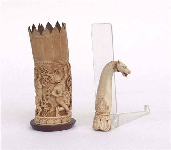 Lotto composto da un manico ed un contenitore in osso Arte indiana, sec. XIX (
