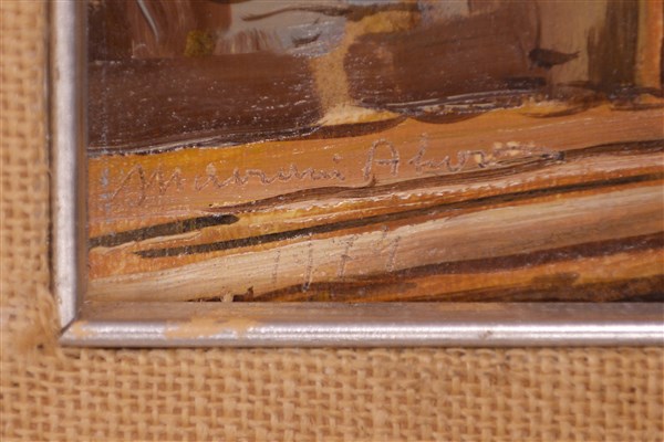 Lotto 606 | Firma indecifrata "Chalet" 1974, olio su cartone (cm 25x35) firmato e datato in