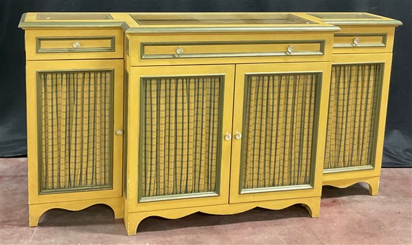 Credenza in legno verniciato a tre cassetti e quattro sportelli a vetrina con tendine abbinate, piano con vetri incolore (cm 165x85x43) (difetti)