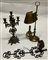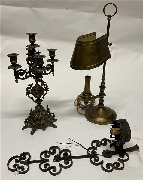 Lotto composto da una lampada da tavolo con struttura e paralume in ottone, un candelabro in metallo a cinque fiamme e un portacero in ferro battuto montato a luce elettrica (difetti)